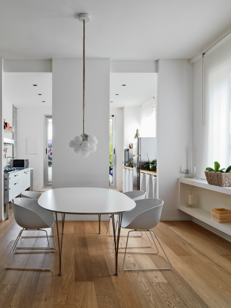 - Osvijetljeni kontrasti: Bijeli zidovi dobro se slažu s tamnijim detaljima. Osim toga, iskoristite obilje prirodnog svjetla: bijele površine reflektiraju ga i čine prostor prostranijim.